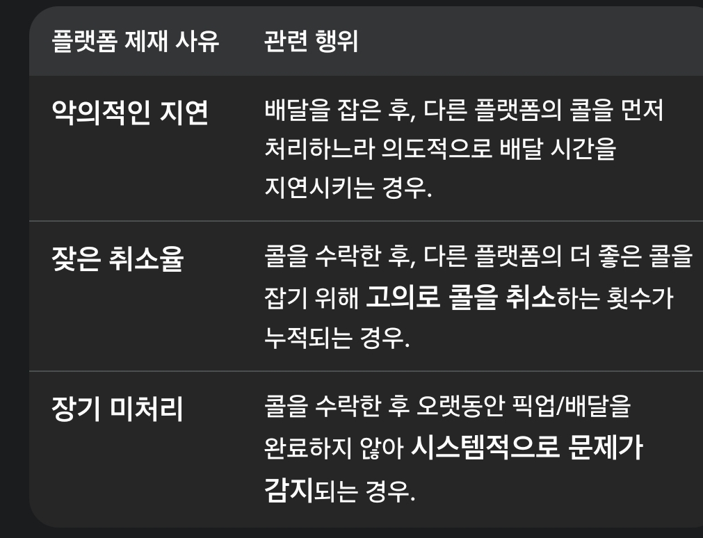 배달 지연: 라이더가 두 건의 콜을 동시에 수행하면 필연적으로 한쪽의 배달 시간이 지연될 가능성이 높습니다. 플랫폼은 고객과의 약속 시간을 어기는 라이더에게 경고, 패널티, 배차 제한 등의 조치를 취할 수 있습니다.