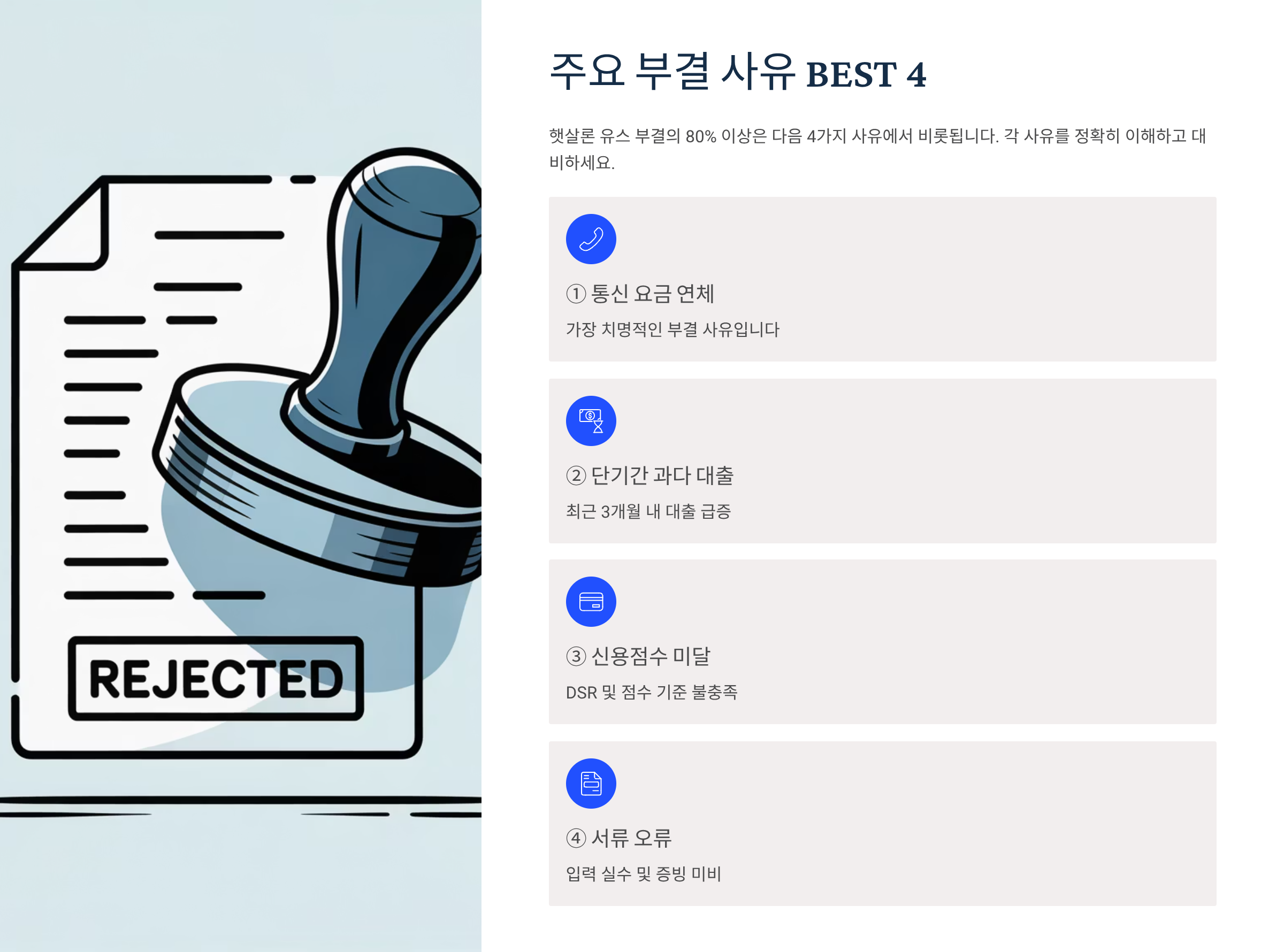 - 연 소득 대비 부채: 이미 연 소득보다 많은 대출을 가지고 있다면 '한도 초과'로 거절됩니다.