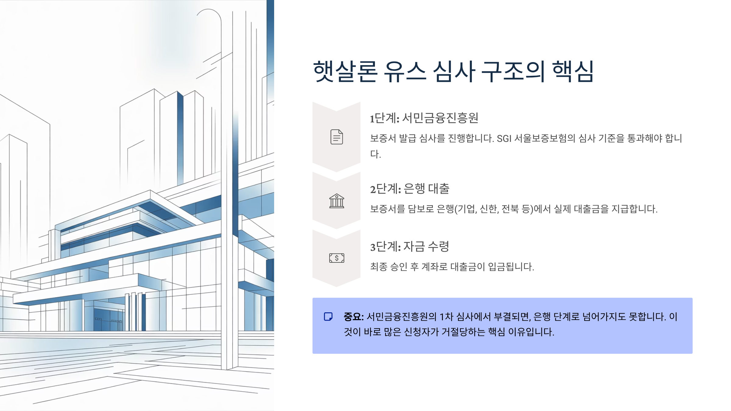 햇살론 유스는 서민금융진흥원이 보증서를 발급해주면, 그 보증서를 담보로 은행(기업, 신한, 전북 등)에서 돈을 내어주는 구조입니다. 즉, 서민금융진흥원(서울보증보험)의 심사 기준을 통과하는 것이 1차 관문입니다. 여기서 SGI 서울보증보험 심사 부결이 뜬다면, 은행은 가보지도 못하고 거절당하게 됩니다.
