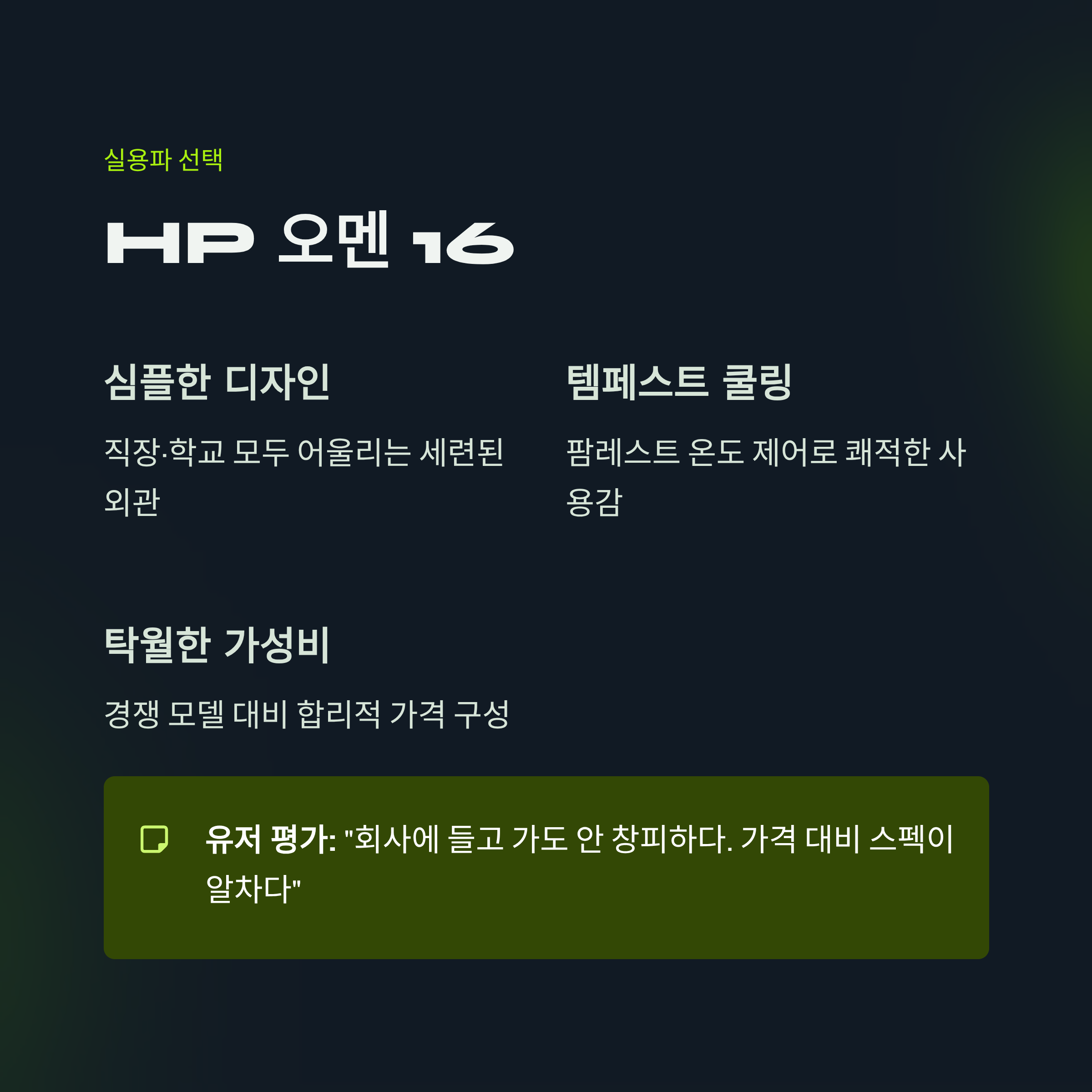 - 특징: 심플한 디자인이지만 성능은 확실합니다. HP만의 "템페스트 쿨링" 기술로 팜레스트(손목 닿는 곳) 온도를 잘 제어합니다.