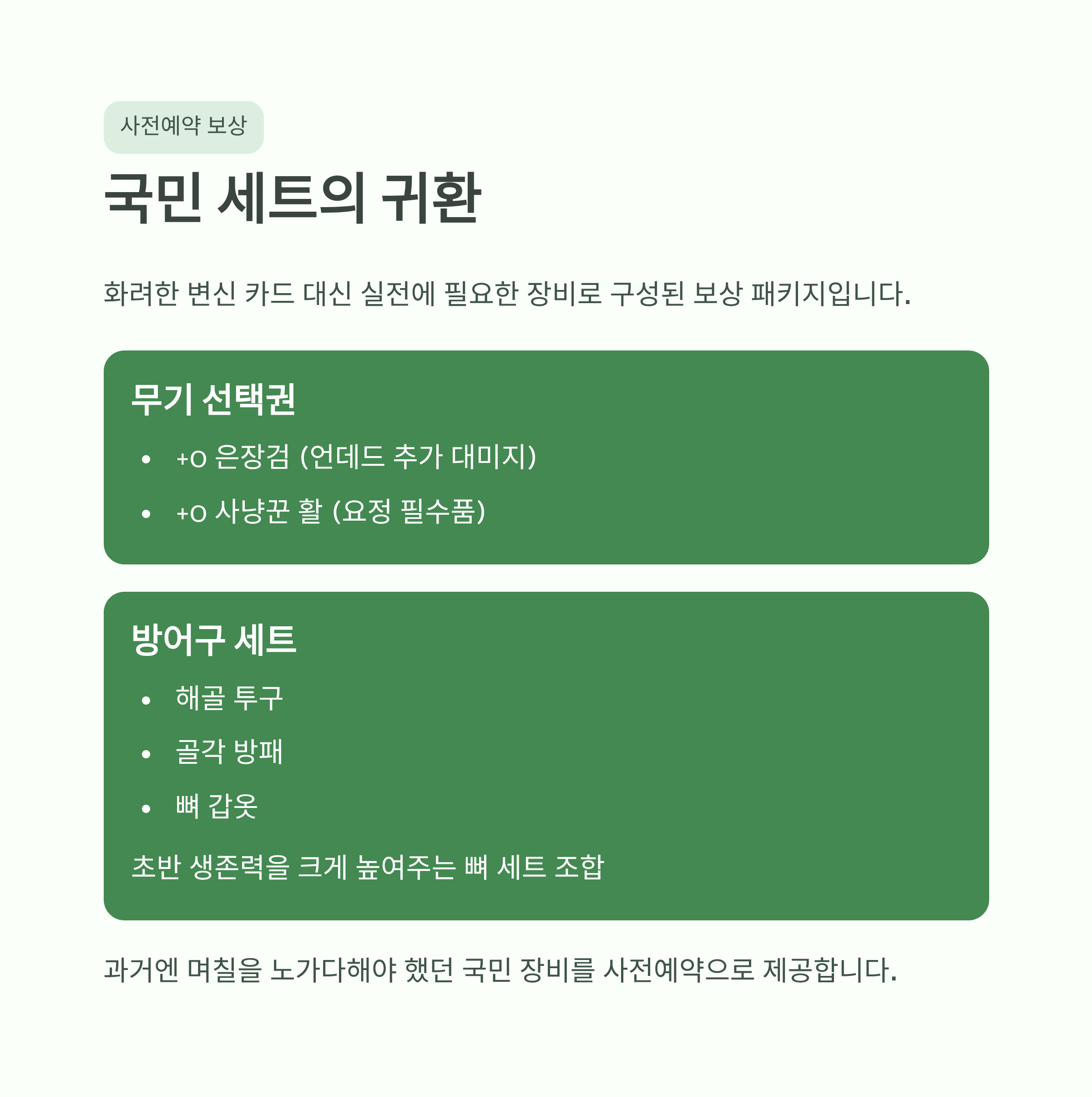 사전예약 보상은 화려한 변신 카드가 아닌, 실제 플레이에 필수적인 "장비"로 구성되어 있습니다.