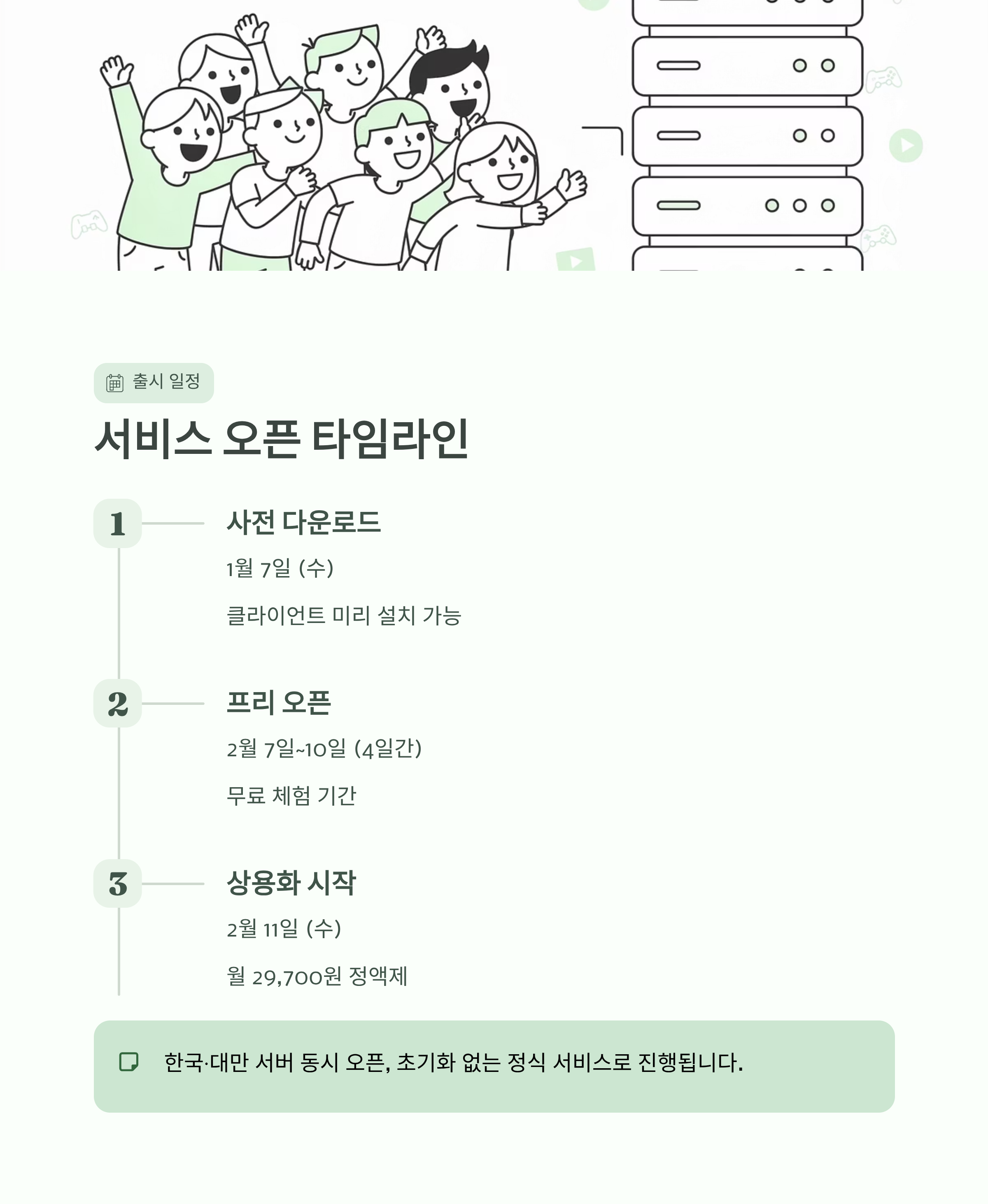 2월 7일부터 4일간은 무료로 서버가 개방되므로, 서버 대기열과 트래픽이 폭주할 것으로 예상됩니다. 미리 1월 7일에 클라이언트를 설치해 두는 것을 권장합니다.