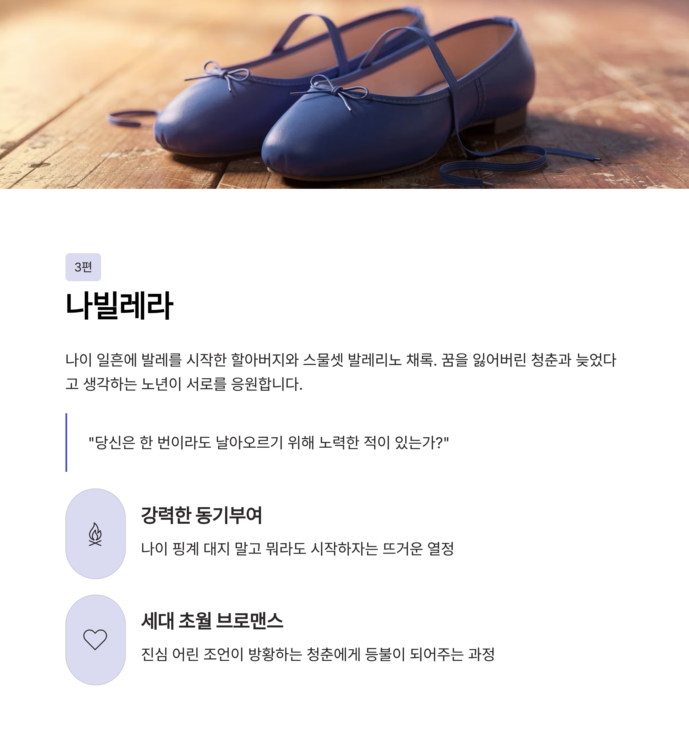 - 강력한 동기부여: 굳은 몸으로 발레 동작을 연습하는 할아버지의 모습을 보면, "나이 핑계 대지 말고 뭐라도 시작하자"라는 뜨거운 열정이 샘솟습니다.