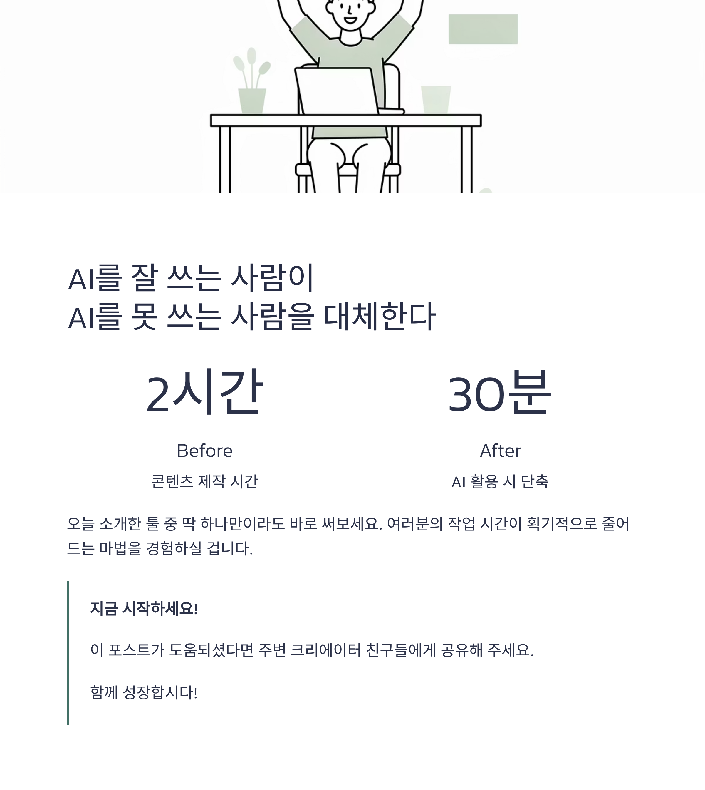 오늘 소개해 드린 툴 중에서 딱 하나만이라도 오늘 바로 써보세요. 블로그 글 하나 쓰는 데 2시간 걸리던 것이 30분으로 줄어드는 마법을 경험하실 수 있을 겁니다. 여러분의 "칼퇴"와 "수익화"를 응원합니다!