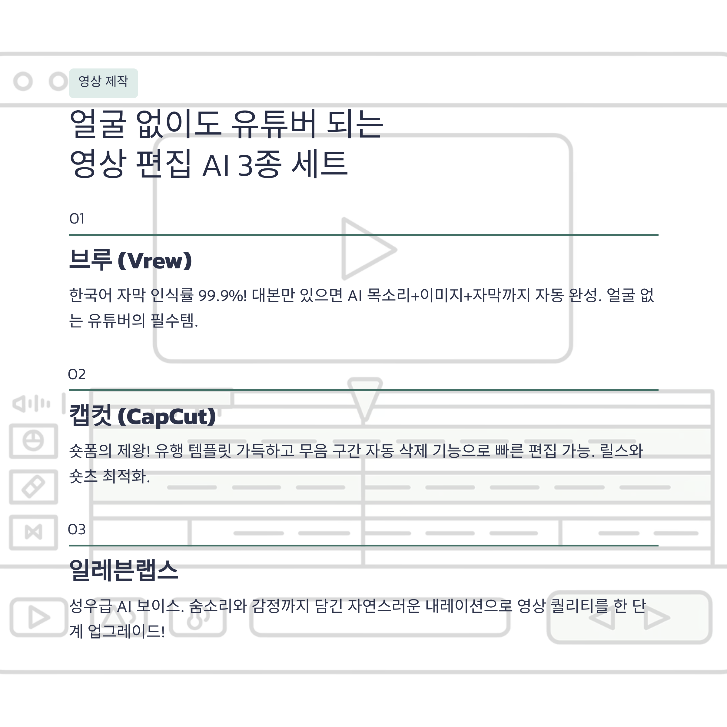얼굴 나오기 부담스럽거나, 편집 기술이 없어도 유튜버가 될 수 있습니다.