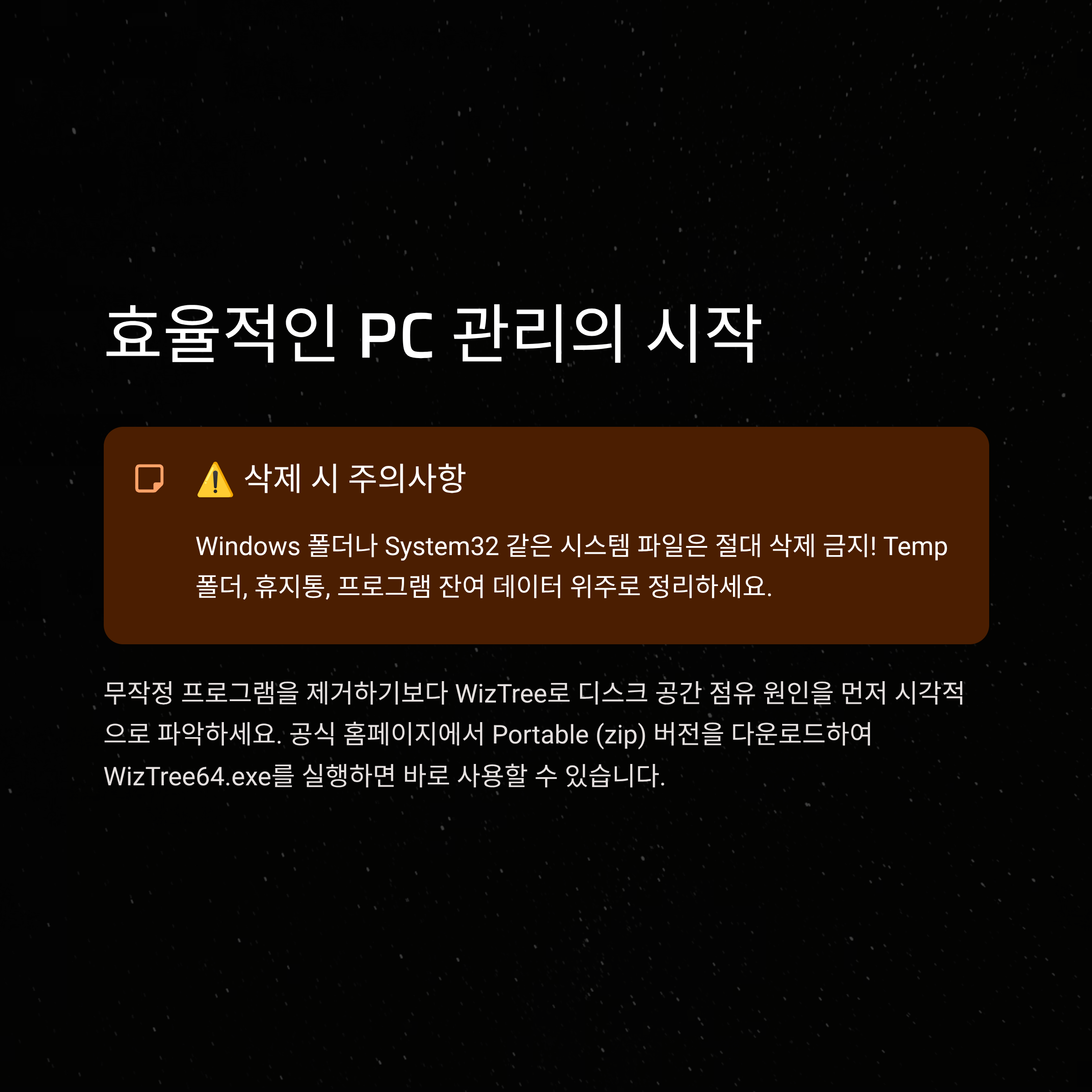 결론 컴퓨터 용량 확보를 위해 무작정 프로그램을 제거하기보다, WizTree를 통해 디스크 공간을 점유하는 원인을 먼저 시각적으로 파악해 보시기 바랍니다. 효율적인 PC 관리를 위한 필수 유틸리티로 강력하게 추천합니다.