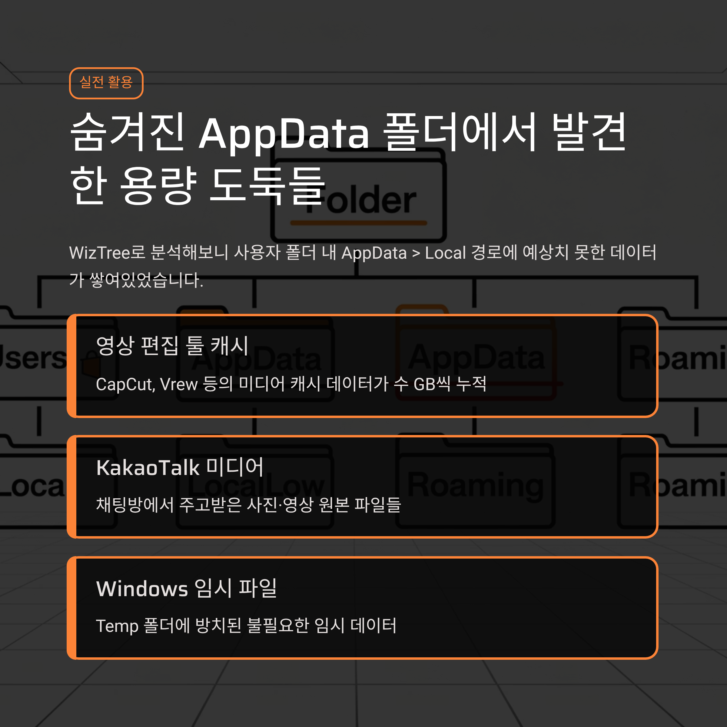 - 실전 분석: 숨겨진 AppData 폴더 관리 WizTree를 실행하면 디스크 사용량을 시각적인 트리맵(Treemap)으로 보여줍니다. 사각형의 크기가 클수록 용량을 많이 차지하는 파일입니다.
