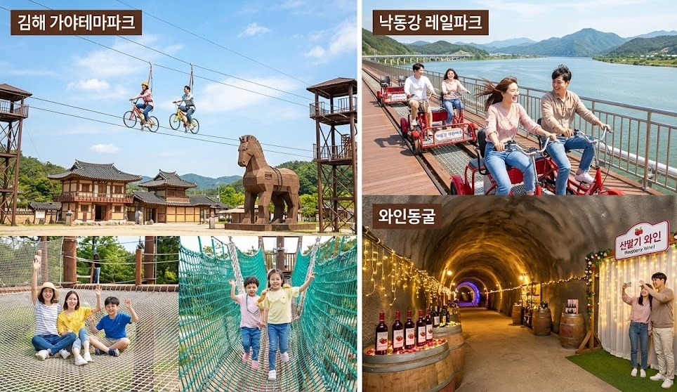 - 동선 추천: (점심) 대동할매국수 or 밀양돼지국밥 → (오후) 봉리단길 카페 투어 & 봉황동 유적 → (액티비티) 가야테마파크 or 레일바이크 → (저녁) 김해 뒷고기 → (야경) 김해천문대 or 연지공원
