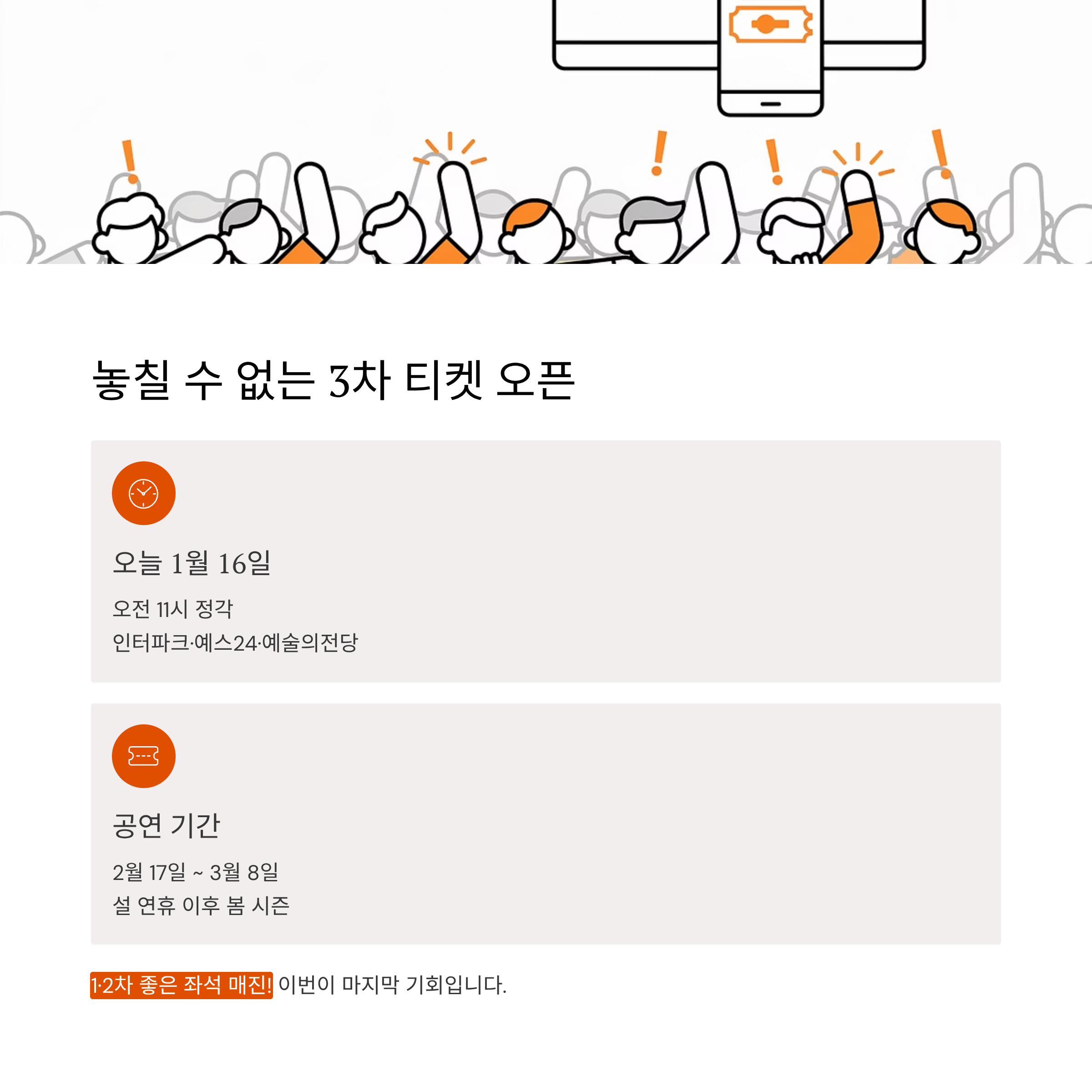 설날 연휴가 지나고 따뜻해지는 2월 말과 3월 초 공연을 원하신다면 이번 3차 티켓팅을 노려보셔야 합니다. 이미 1, 2차 티켓은 좋은 좌석이 대부분 매진되었기 때문에 취소표를 줍거나 이번 3차 오픈을 공략하는 것이 가장 확실한 방법입니다.