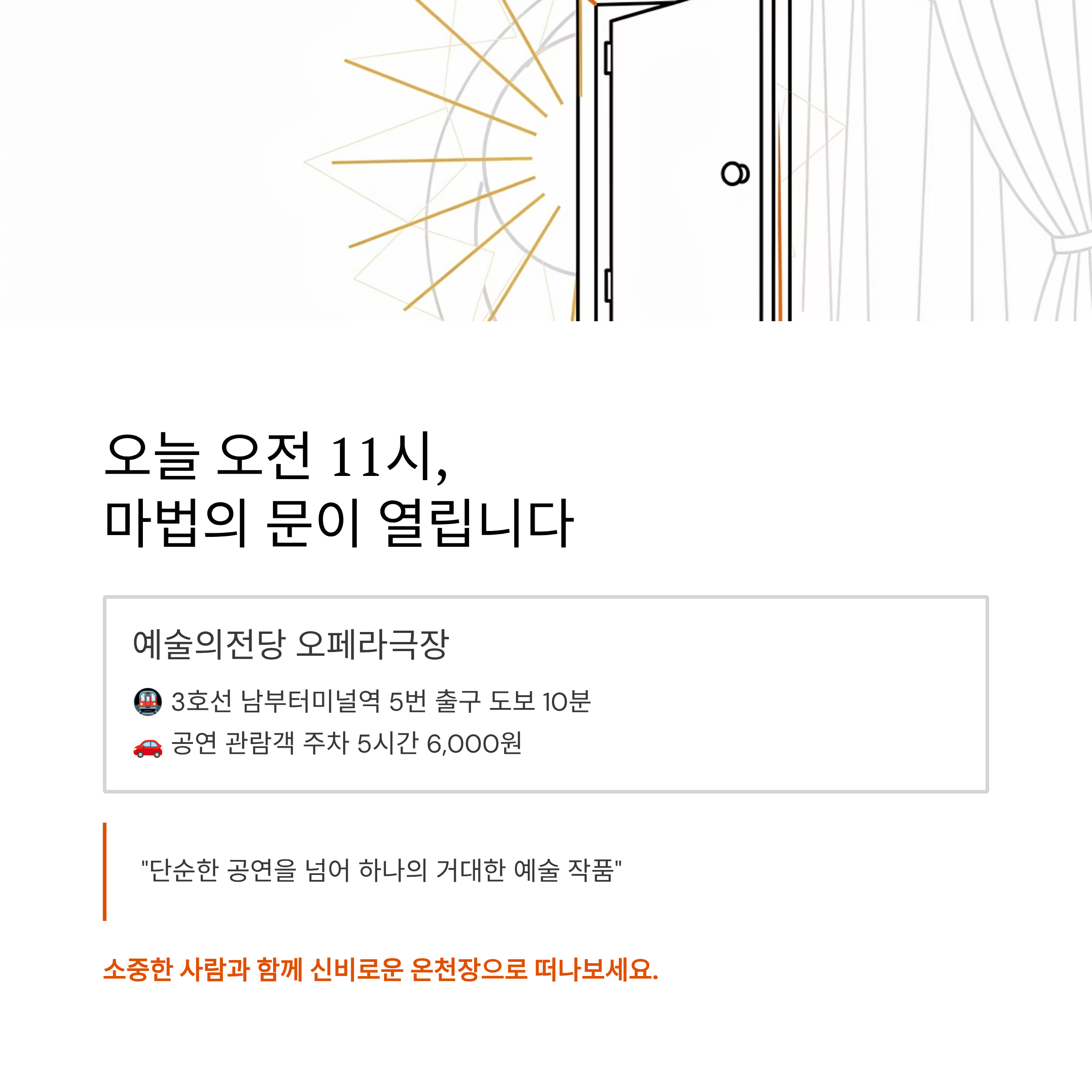 지하철 이용 시 3호선 남부터미널역 5번 출구에서 도보로 약 10분 정도 걸리며, 역 앞에서 셔틀버스나 초록 버스를 타고 이동하셔도 됩니다. 자차 이용 시 오페라극장 주차장을 이용하시면 됩니다. 공연 관람객은 5시간에 6,000원이라는 저렴한 가격으로 주차 할인을 받을 수 있습니다. 단, 주말에는 주차장이 매우 혼잡하니 대중교통 이용을 추천합니다.