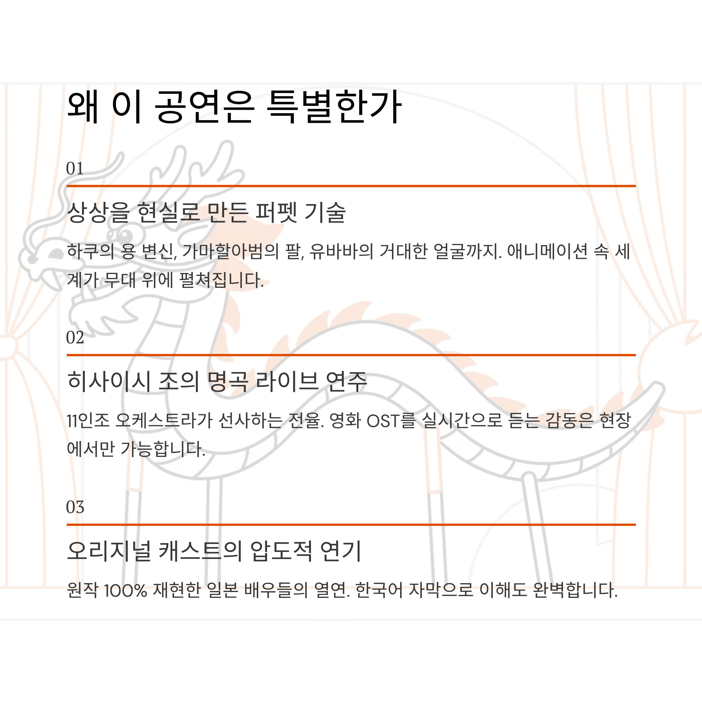 둘. 히사이시 조의 명곡 라이브 연주 영화에서 듣던 아름다운 선율을 11인조 오케스트라의 라이브 연주로 감상할 수 있습니다. 특히 마지막 엔딩 곡이 흐를 때의 전율은 현장에서만 느낄 수 있는 감동입니다.