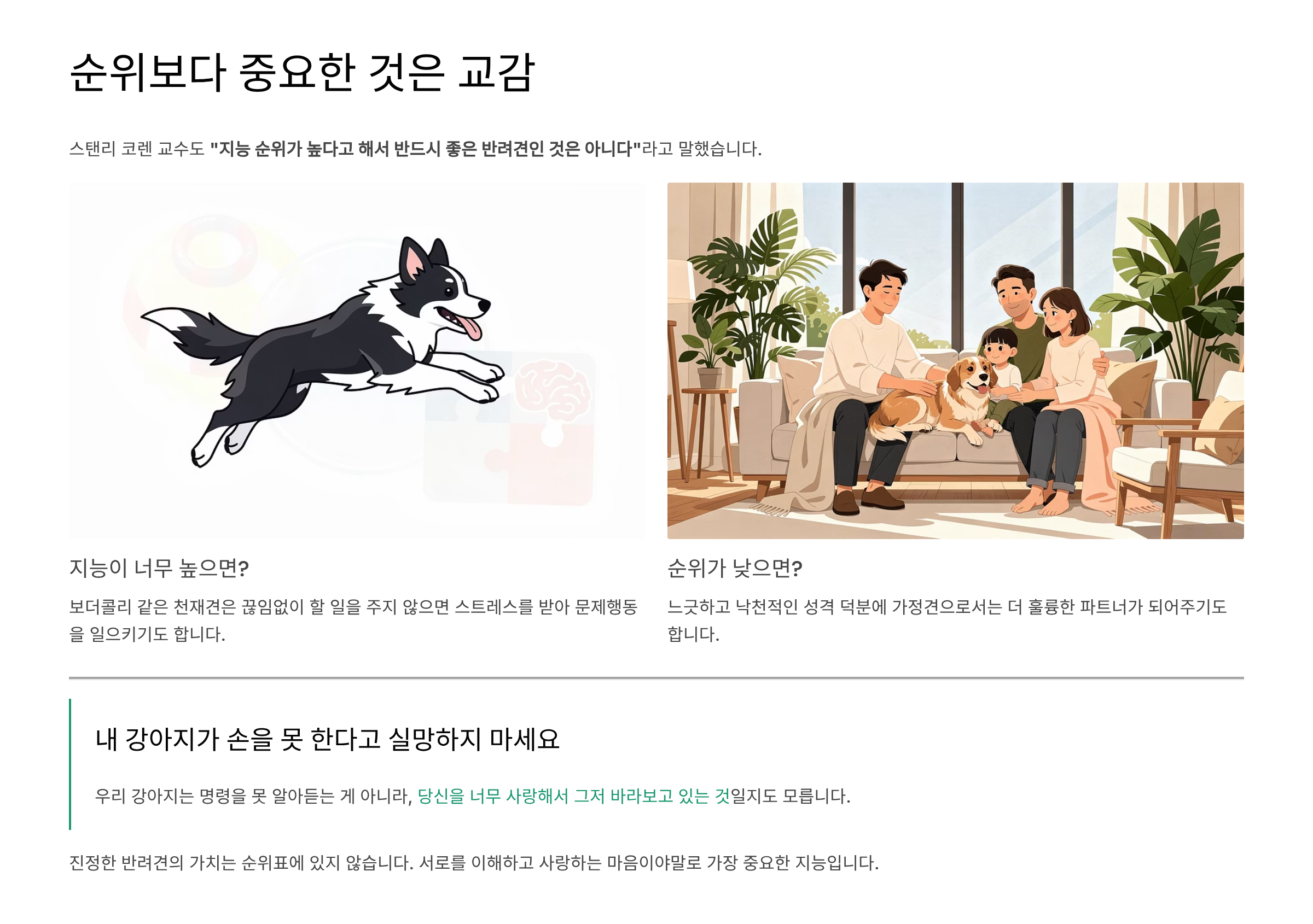 우리가 흔히 보는 순위표는 바로 세 번째, 복종형 지능을 기준으로 합니다. 즉, 순위가 높다는 것은 사람의 말을 빨리 알아듣고 잘 복종한다는 뜻이며, 순위가 낮다고 해서 멍청하다는 뜻은 결코 아닙니다.