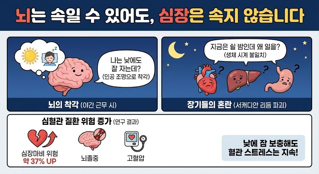 이로 인해 야간 근무자는 주간 근무자에 비해 심장마비 위험이 약 37% 더 높고, 뇌졸중이나 고혈압 같은 심혈관 질환에 걸릴 확률이 유의미하게 높다는 연구 결과가 있습니다. 낮에 잠을 보충한다고 해서 혈관이 받는 스트레스까지 사라지는 것은 아닙니다.