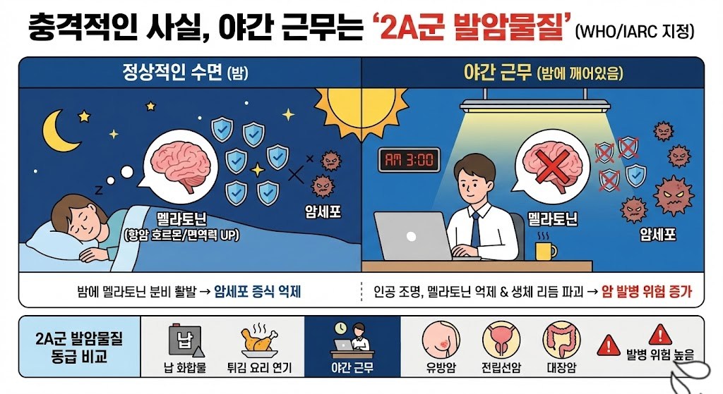 가장 먼저 짚고 넘어가야 할 무서운 팩트가 있습니다. 세계보건기구(WHO) 산하 국제암연구소(IARC)는 야간 근무(Night Shift Work) 자체를 '2A군 발암물질'로 지정했습니다. 납 화합물이나 튀김 요리 시 나오는 연기와 동급이라는 뜻인데요. 그 핵심 원인은 바로 '멜라토닌'과 '생체 리듬' 파괴에 있습니다.
