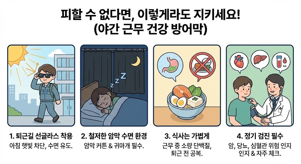 - 식사는 가볍게: 근무 중 야식은 소화가 잘 되는 단백질 위주로 조금만 드시고, 퇴근 직전(아침)에는 식사를 자제하여 집에 가서 바로 잘 수 있는 위장 상태를 만드세요.