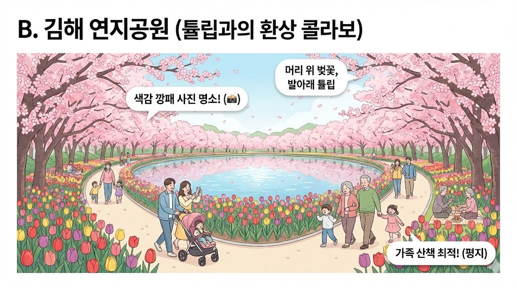 B. 김해 연지공원 (튤립과의 콜라보) 김해 시민들의 휴식처인 연지공원은 호수를 둘러싼 벚꽃 터널도 일품이지만, 바닥에 심어진 수만 송이의 튤립이 하이라이트입니다. 머리 위에는 연분홍 벚꽃이, 발아래에는 알록달록한 튤립이 피어있어 색감 깡패라 불리는 사진 명소입니다. 평지라서 아이들이나 부모님과 함께 산책하기에 가장 편안한 장소입니다.
