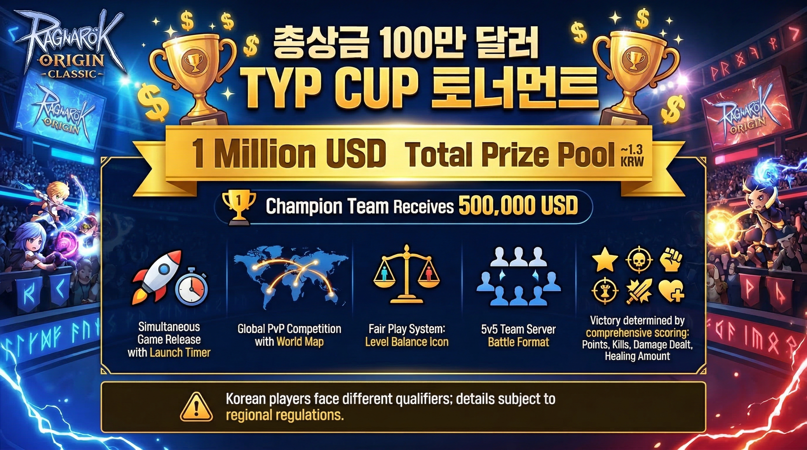 정식 출시와 동시에 글로벌 PvP 대회 'TYP CUP' 이 개최됩니다. 총상금 규모가 100만 달러(약 13억 원) 에 달하는 대형 토너먼트로, 모든 참가자에게 동일한 성장 조건을 제공하는 공정 경기 시스템을 기반으로 진행됩니다. 5대5 팀 서버 대항전 방식으로, 승패는 포인트·킬 수·피해량·힐량 등을 종합해 결정됩니다. 우승 팀에게는 50만 달러의 상금이 돌아갑니다. 다만 한국 유저는 지역 법규로 인해 대회 참가가 어렵다는 점은 아쉬운 부분입니다.