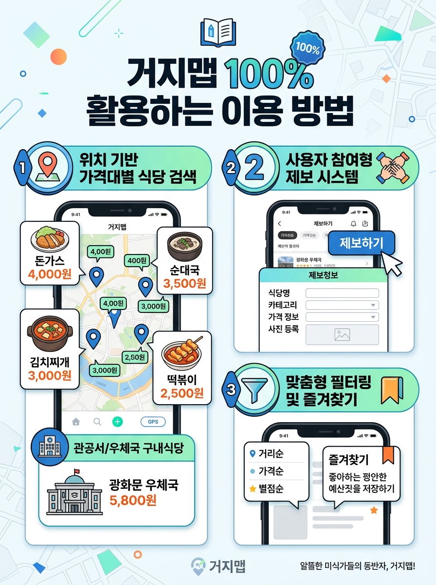 둘째, 사용자 참여형 제보 시스템입니다. 지도를 보다가 내가 아는 저렴한 맛집이 빠져있다면 직접 추가할 수 있습니다. 사이트 상단의 '제보하기' 버튼을 누르고 식당 상호명, 카테고리, 메뉴명, 가격만 입력하면 누구나 쉽게 정보를 등록하여 다른 사람들과 공유할 수 있습니다.