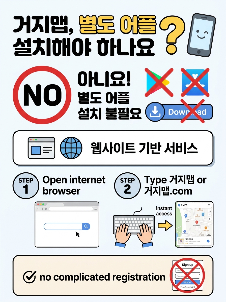 가장 많은 분들이 헷갈려 하시는 부분입니다. 결론부터 말씀드리면 거지맵은 스마트폰에 다운로드해야 하는 전용 어플(앱)이 아닙니다.
