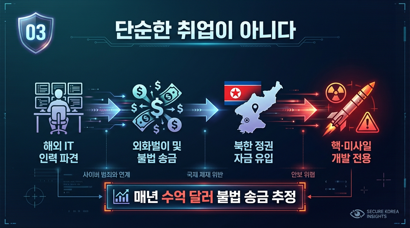 이 문제가 단순히 "신분을 속인 취업 사기" 수준이 아닌 이유가 있습니다. 이들이 글로벌 IT 기업에서 취득한 급여가 김정은 정권으로 불법 송금되고 있으며, 그 자금이 핵·미사일 등 무기 개발에 사용되고 있다는 의혹이 강력하게 제기되고 있기 때문입니다.